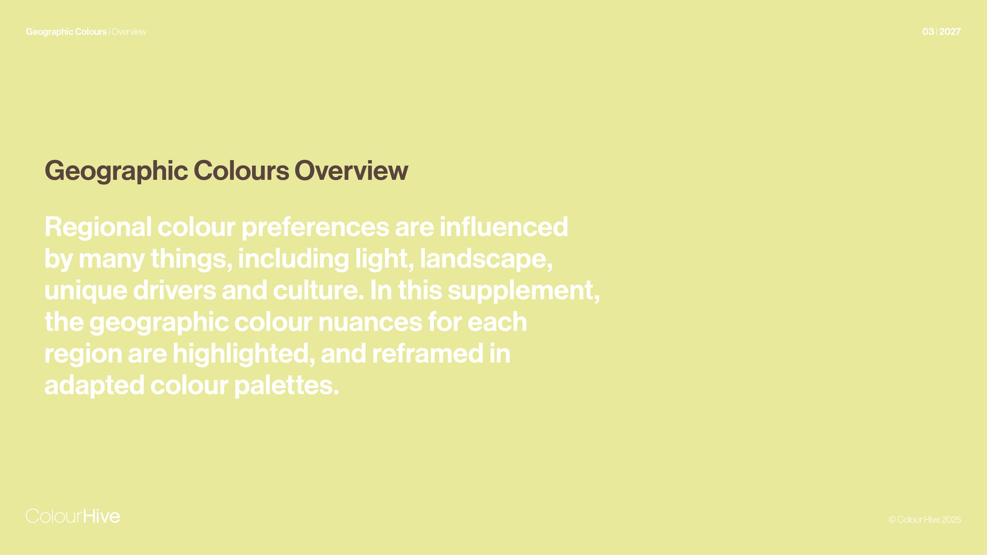 Geographic Colours 2027 Forecasts Geographic Colours 2027 An in-depth exploration of regional colour preferences for eight global regions. 2027 Design Directions COLD, UNDER, FOLLY & HIDE. Colour Hive 08 August, 2025 - 5 min read An in-depth exploration of regional colour preferences for eight global regions. 2027 Design Directions COLD, UNDER, FOLLY & HIDE. This post is for subscribers on the Pioneer tier only. Subscribe now for access to Colour Hive insights with downloadable reports and images. Subscribe now Already a member? Sign in